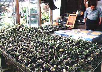 次に、時代物、実生棚を見せてもらう。 ほとんど縞羅紗系だそうで、3800粒蒔いてあるとか、そろそろ、根も出して小さな白い芽が少し見えてきています。 「この中から、1本でも2本でも良い物が生えてくれると嬉しいんですがね、なかなかこれと思うような物は生えてくれませんね」、と謙遜の言葉が返ってきた。 その奥に、ガラスケ―ス四段の別の苗床が見えます。七箱入っていて、3月15日に千代田系ばかり2400粒の種を蒔いたそうです。 「羅紗千代田はまだ小さくて確認するのにはもう少し時間がかかりますね、1本でも生えてくれると苦労も吹っ飛びますが…」 「早く鉢上げしないとと思うのですが、今はご覧のとうり交配で忙しくてどうすることもできないんです。遅れると間延びしてしまい実生品評会に入賞することはなかなか難しいですね」と困った顔。 「二週間後ぐらいからぼちぼち鉢上げしますよ、この作業は実生家の醍醐味、宝探しみたいで楽しみですからね」 |