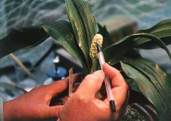 「雌花が早く咲いても、この花粉が使えますから、何の心配もいりませんよ。面倒な乾燥も必要ありませんしね」 実親ハウスに置いてある小型冷蔵庫の中は、この箱でびっしりでした。 「それでは、この花粉を使って交配をやってみます、簡単ですよ」 いよいよ、西尾流交配を見せてもらうことに――。 「ボ―ルペンの芯を抜き、先端に爪楊枝を差し込みます。爪楊枝の先端は花粉がよく見えるように黒く塗っておいて下さい。そして、コップに浸けておけば爪楊枝が膨らみ動かなくなりますよ」 「ピンセットや竹ベラは先が堅くて雌しべの先を傷めますから、この爪楊枝は先が柔らかくていいんですよ」 「このやり方は吉村さんに教えてもらいました、すばらしいアイデアでしょう」 |